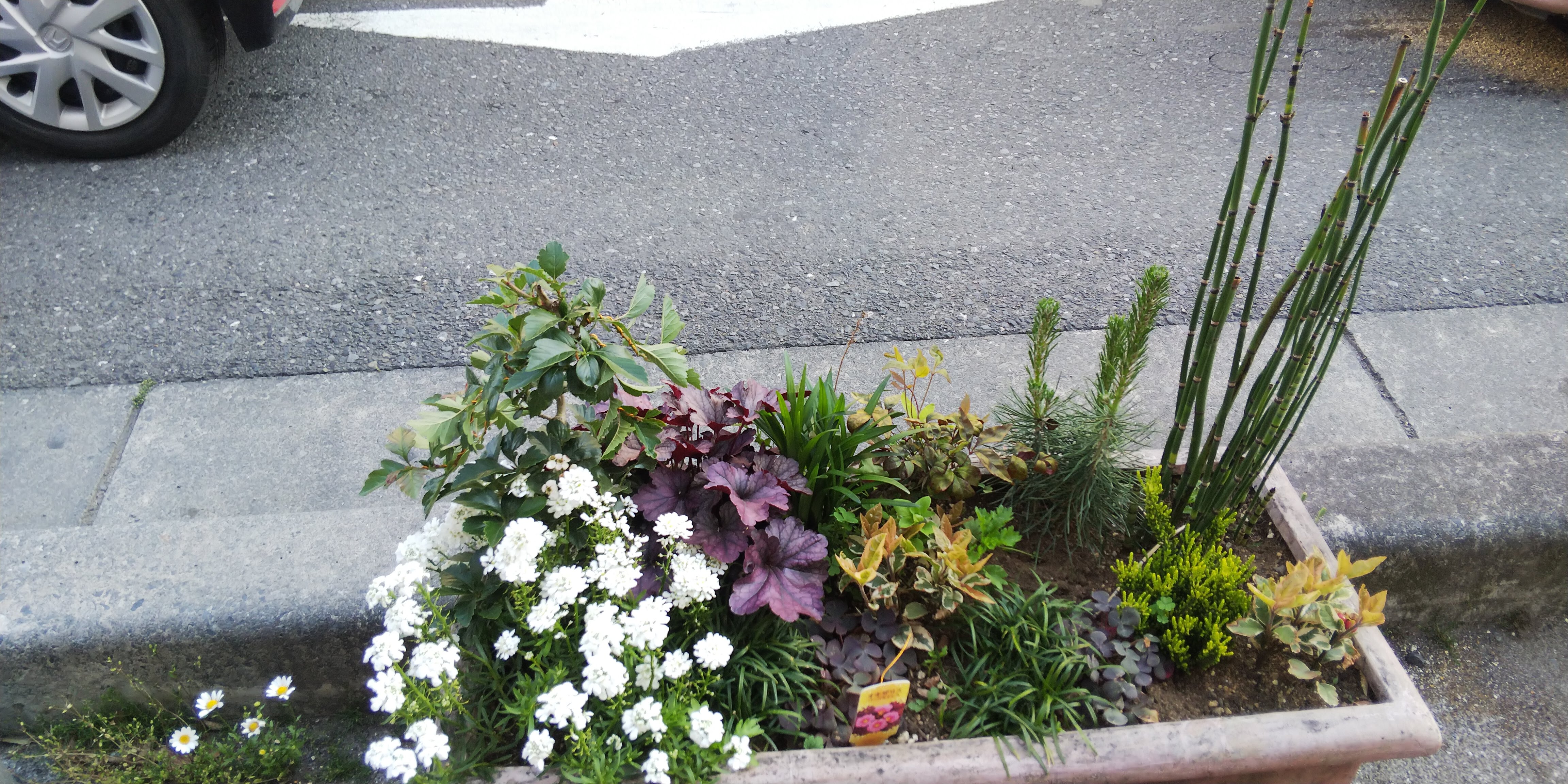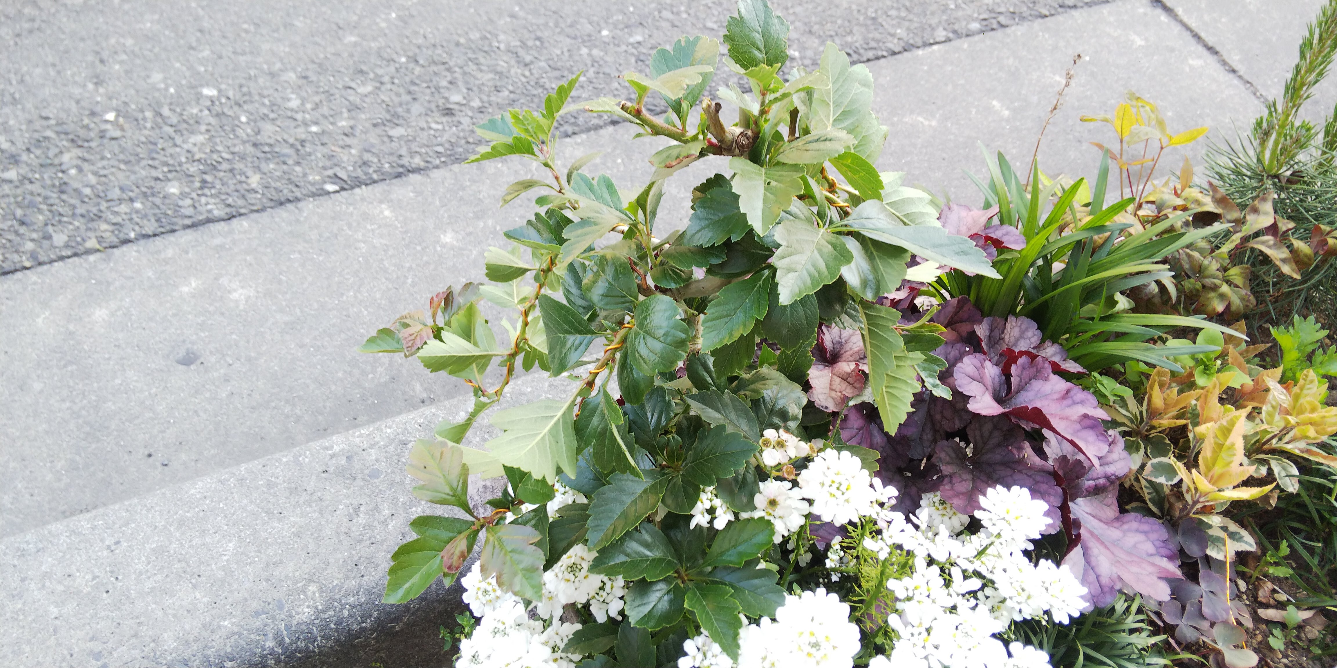 3月にみんなで植えた和風植物のコンテナ、現在は山査子と常盤薺が満開。春らしい、白いお花がきれいです。