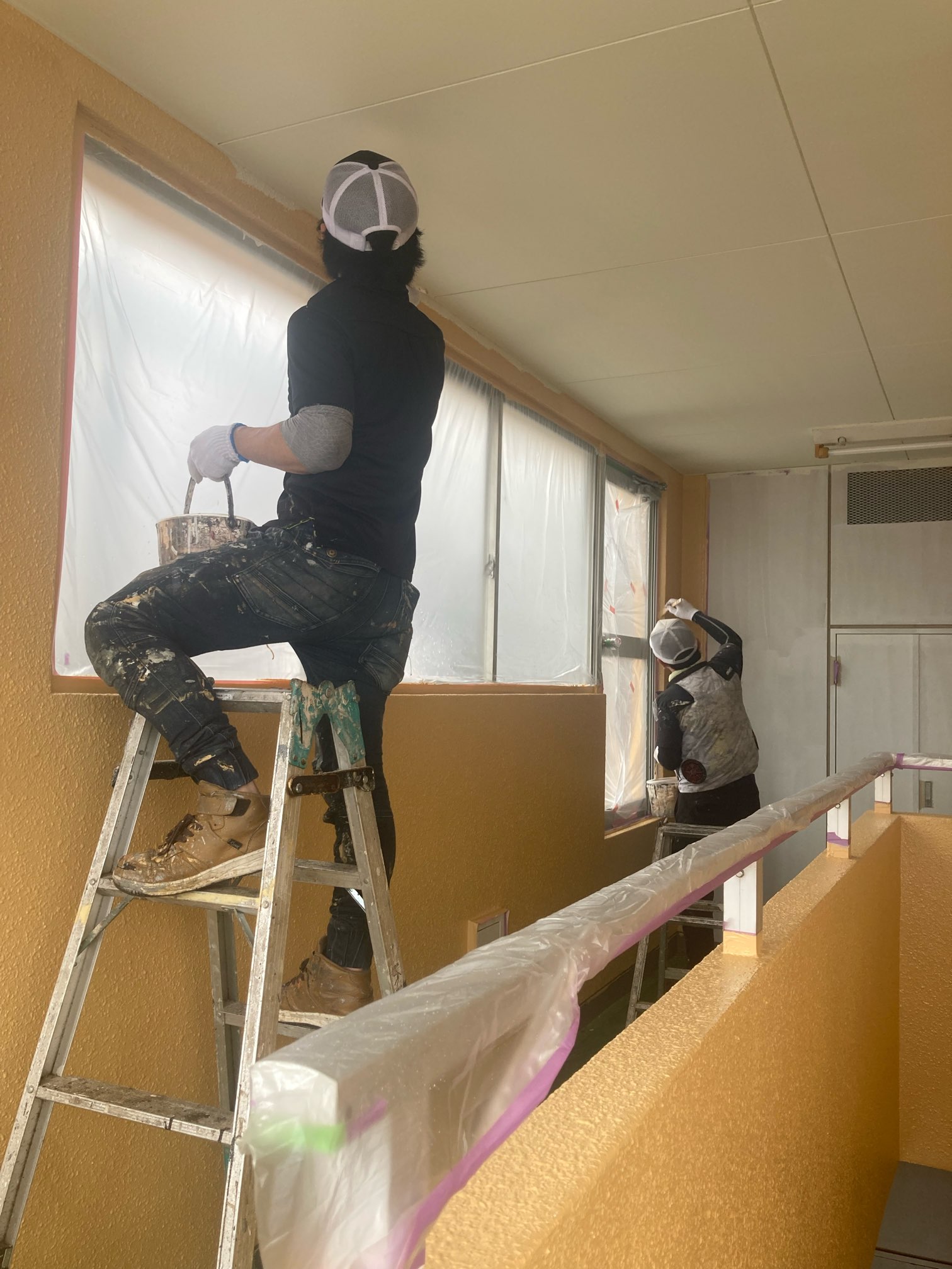 この日もあいにくの雨で職人さんたちは内階段の細かい部分を塗ってくれてました。