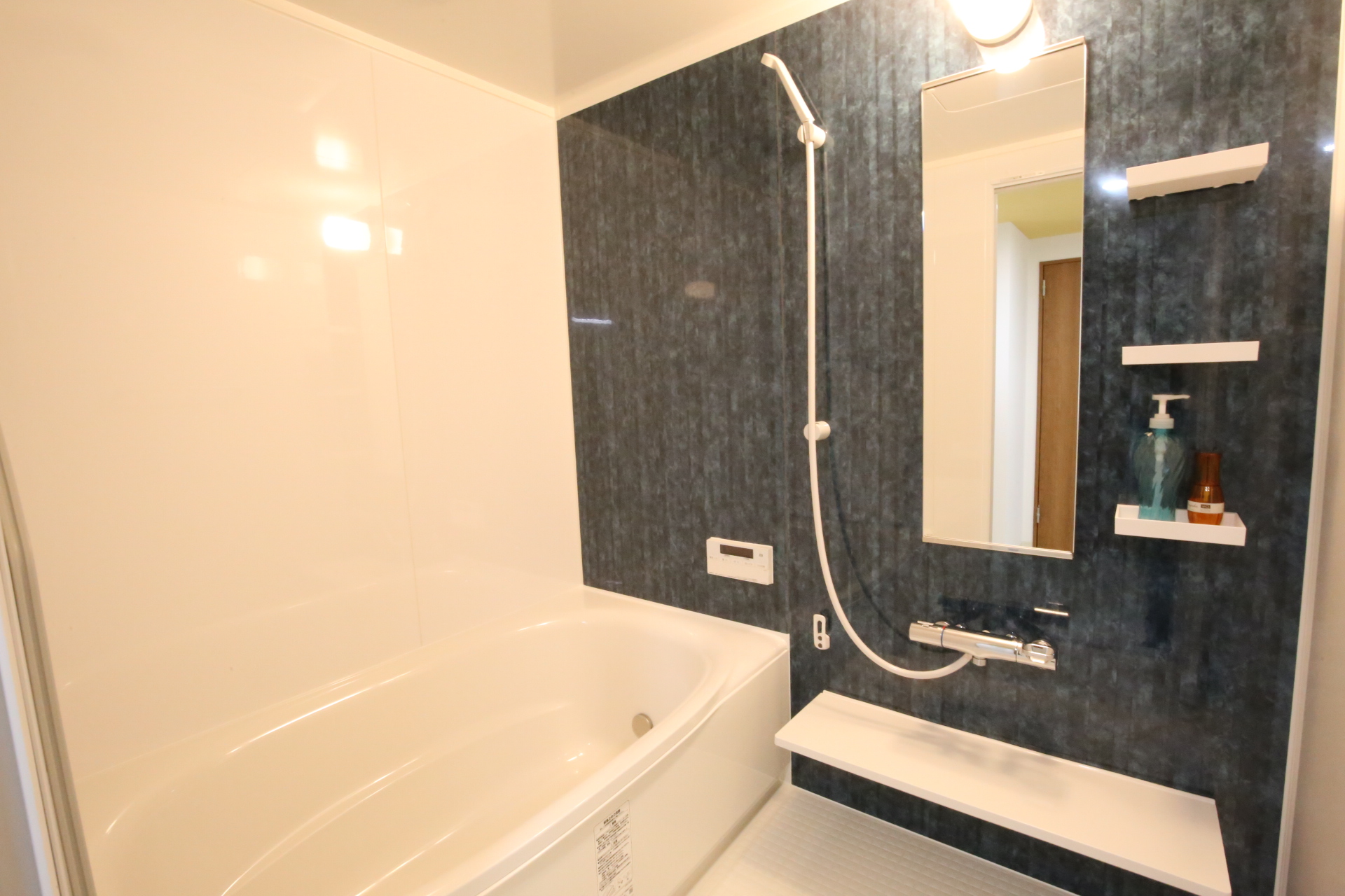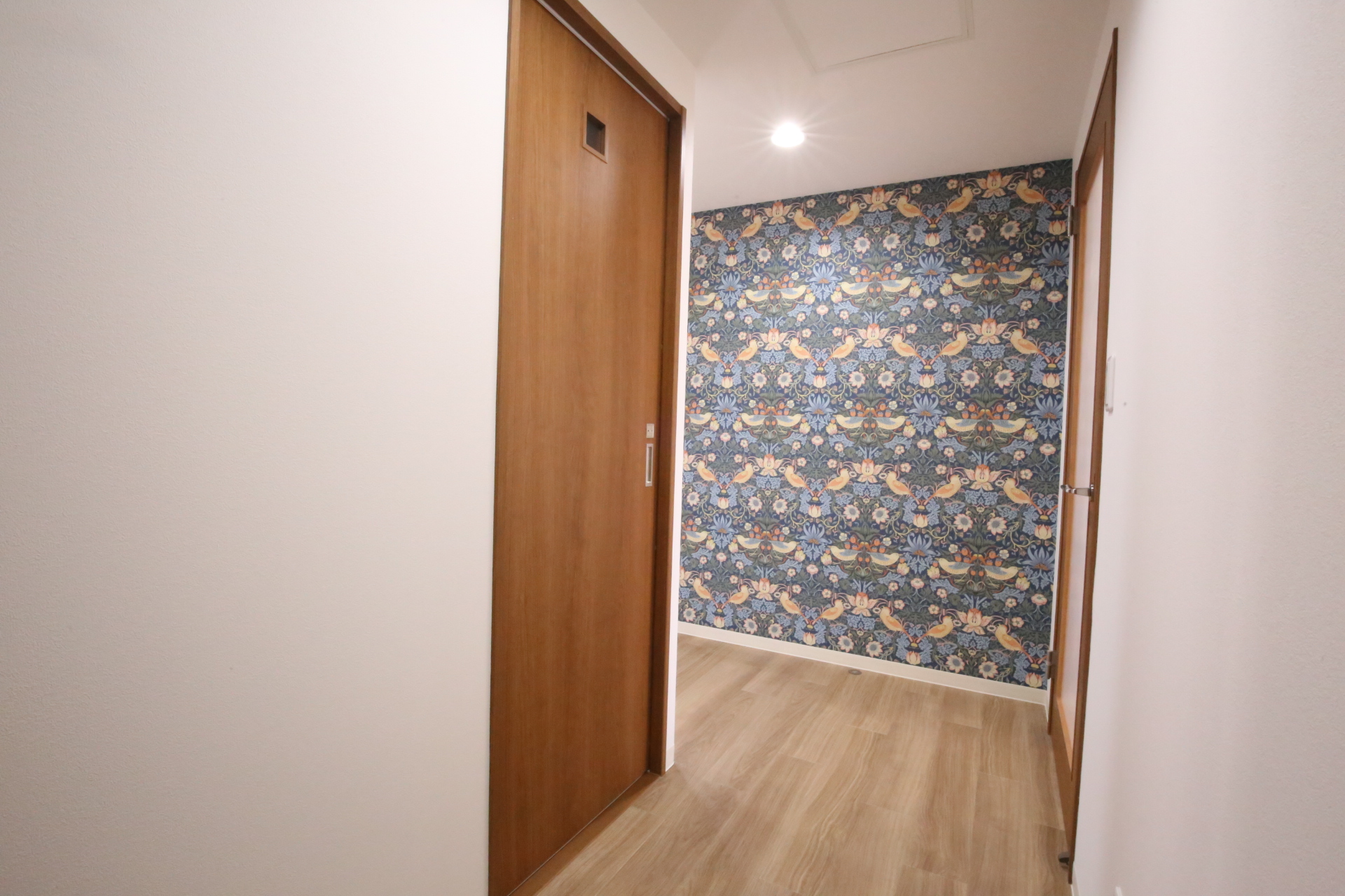 ウイリアム・モリスの壁紙クロスをアクセントに使いました。浴室は大きな1418(縦1m40㎝、横1m80㎝)、一面は落ち着けるよう濃いブルーで仕上げました。