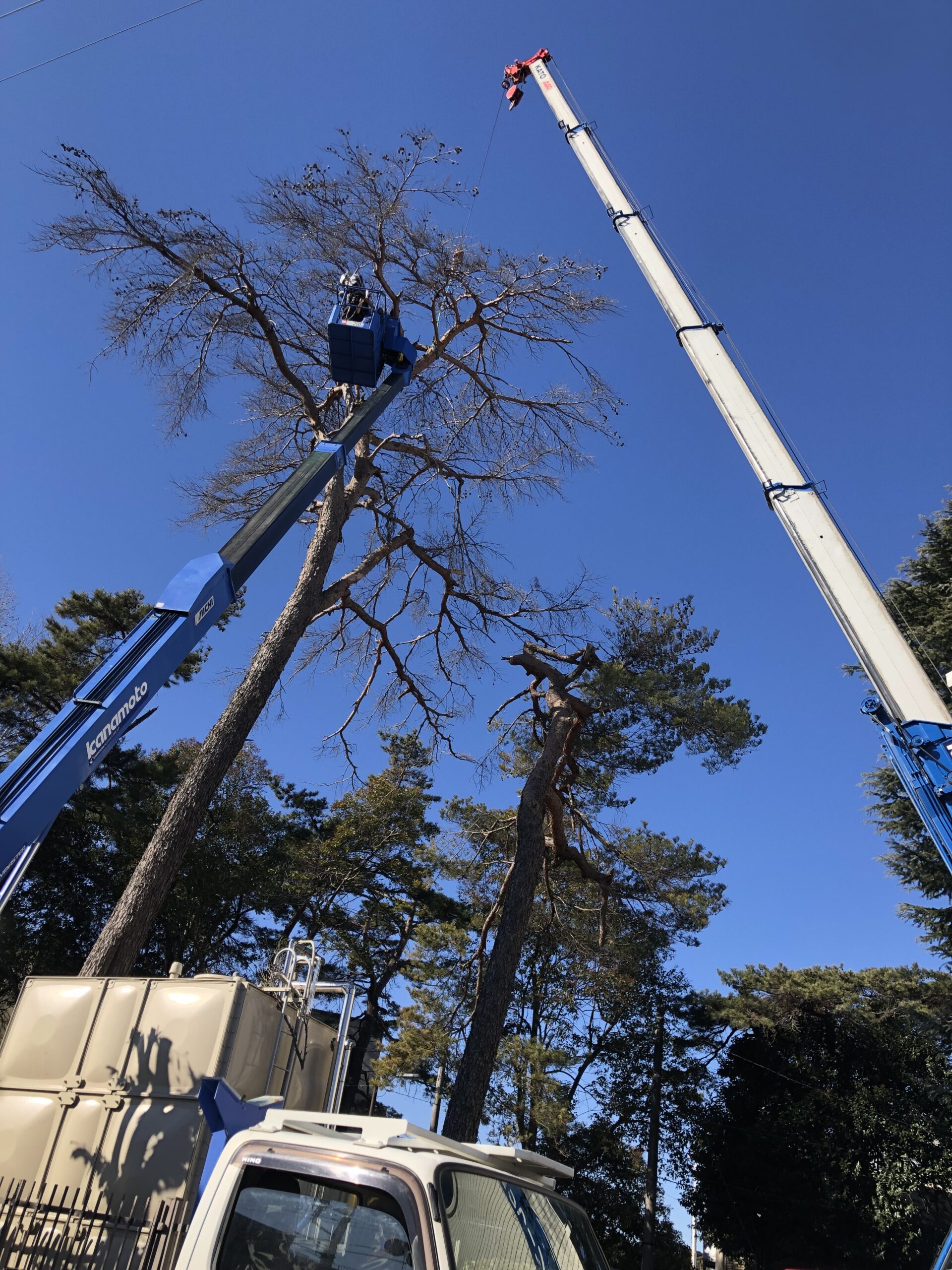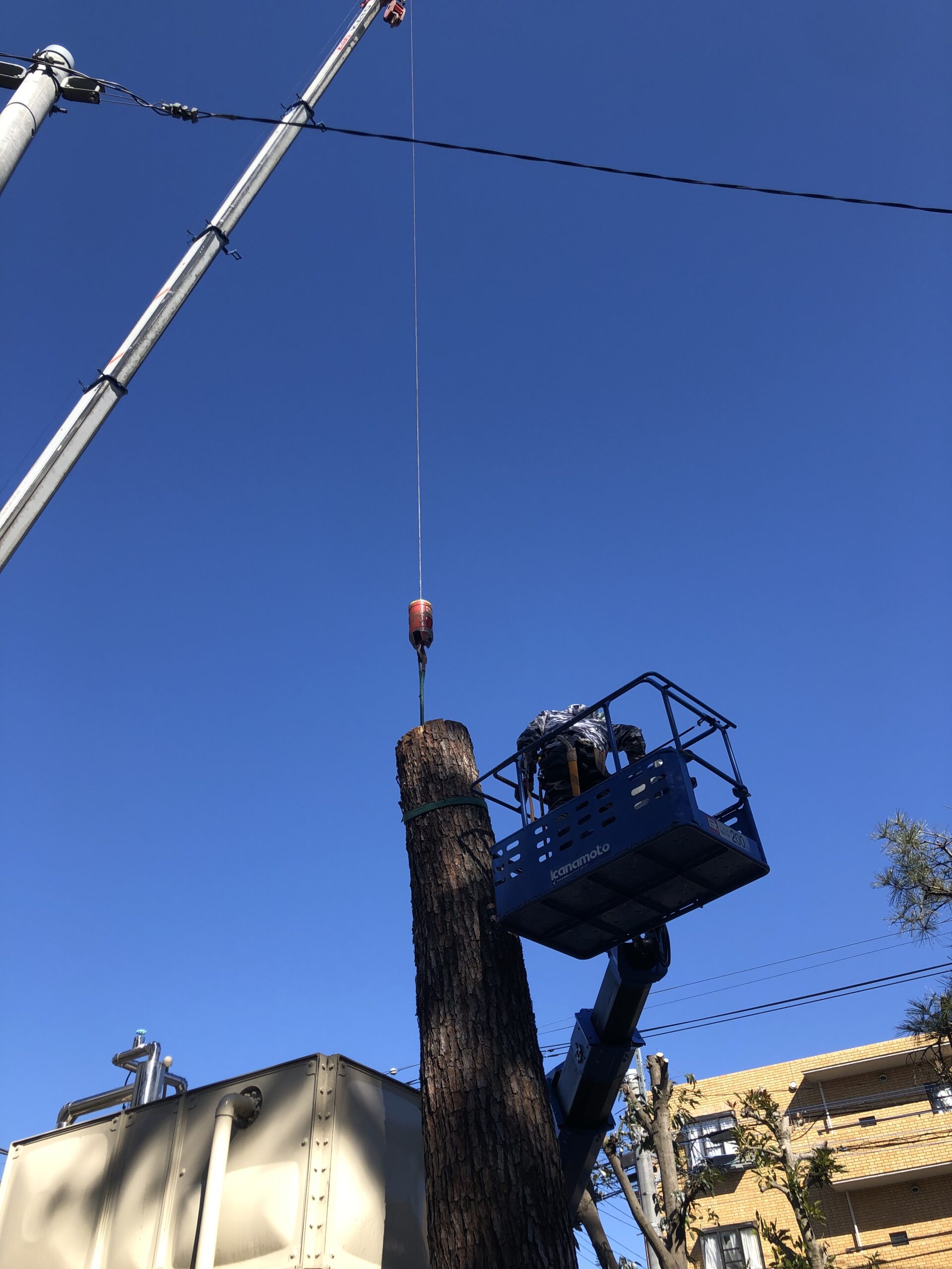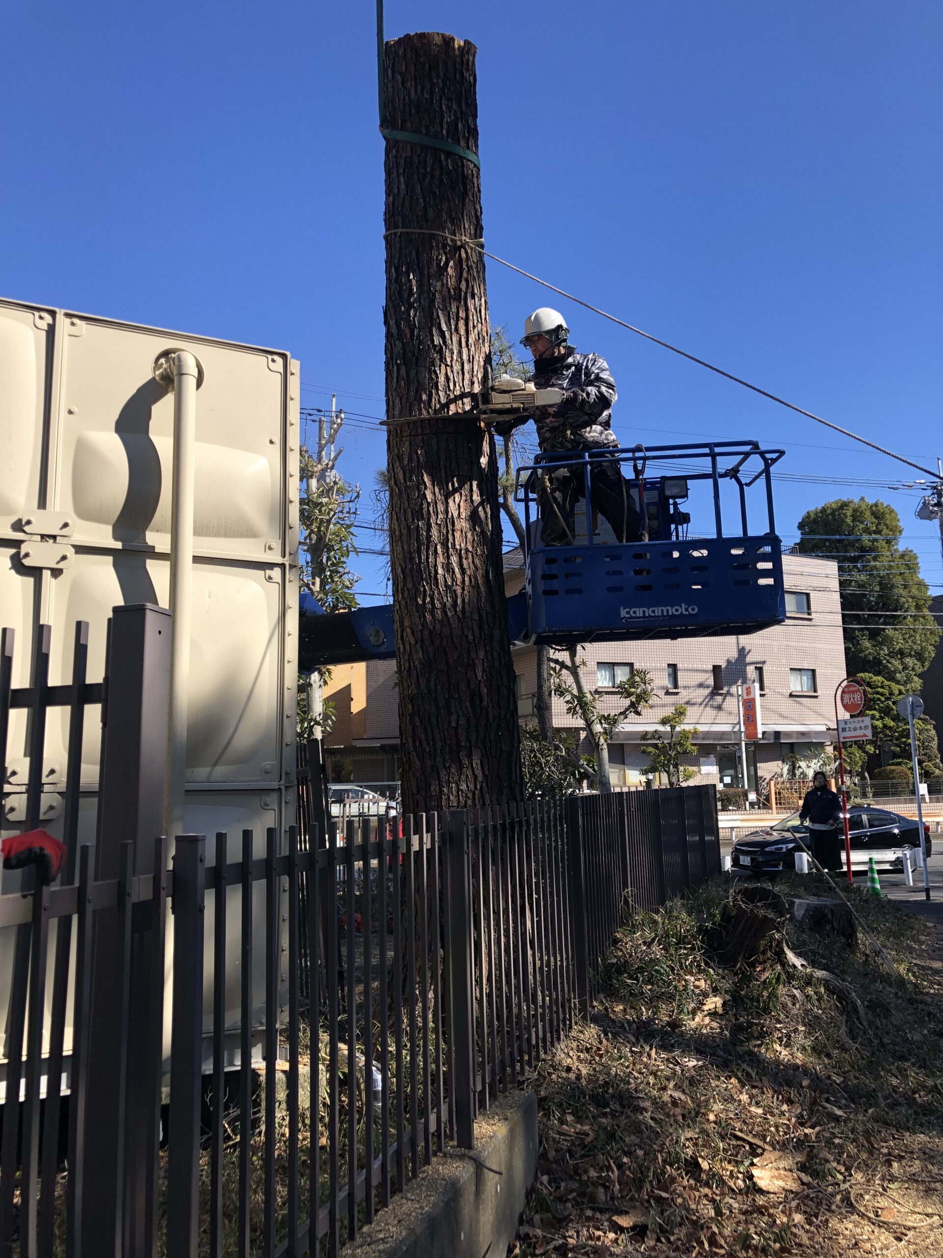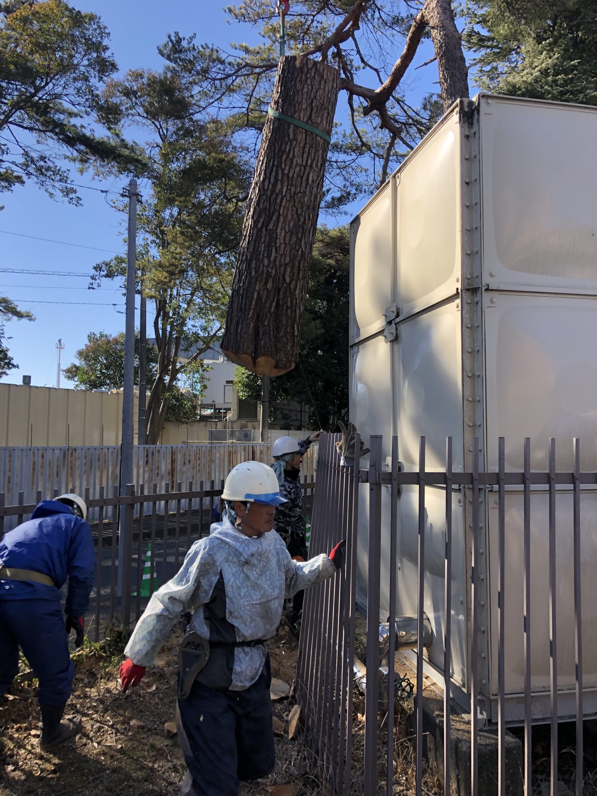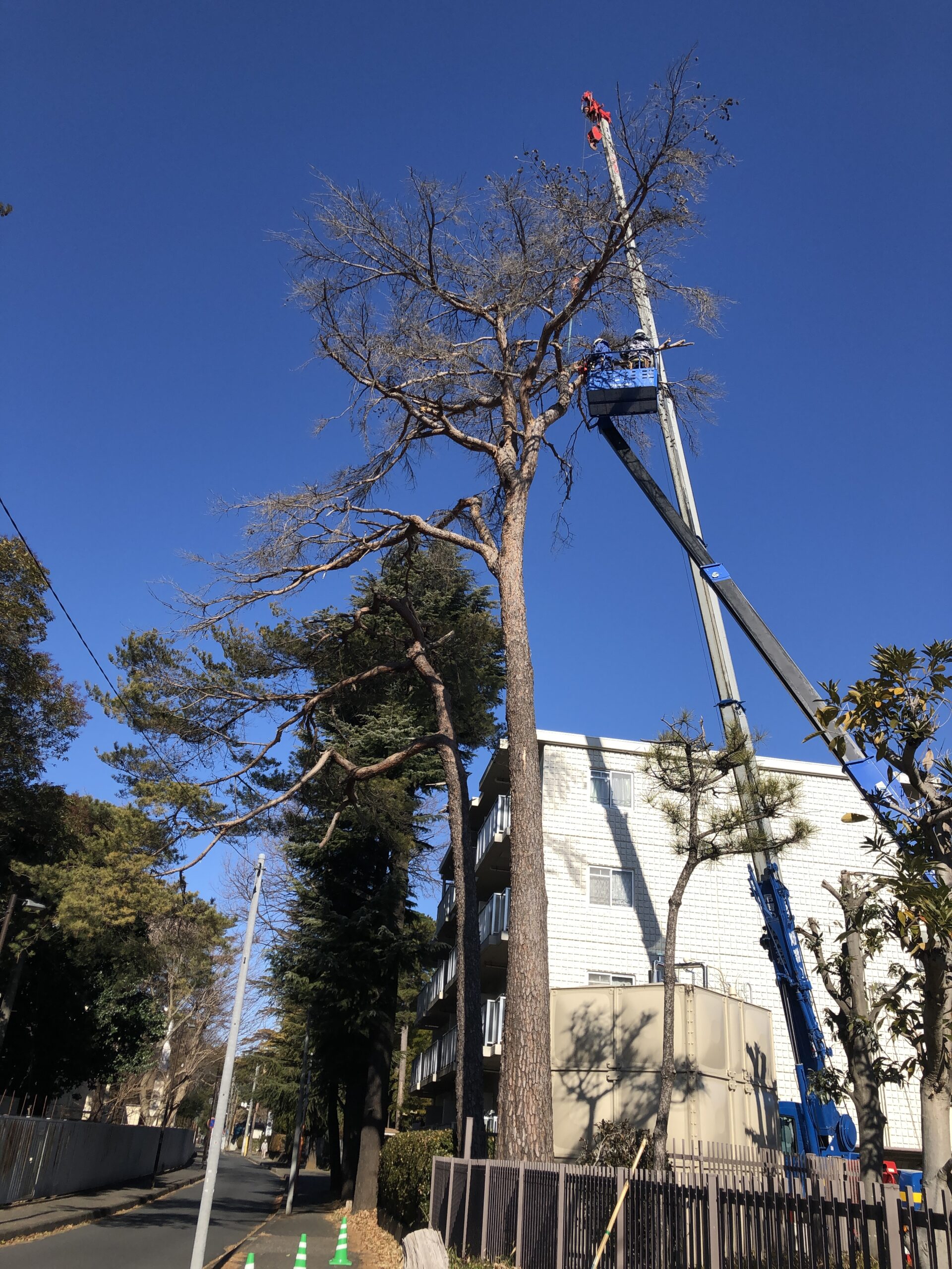 大宮公園に隣接した寿能町の物件、パークハイムは木々の緑豊かな環境です。それは良いのですが、枯れた松が2本あり、倒れて人に怪我でもさせたら大変なことになるので、熟慮の末、伐採することにしました。
