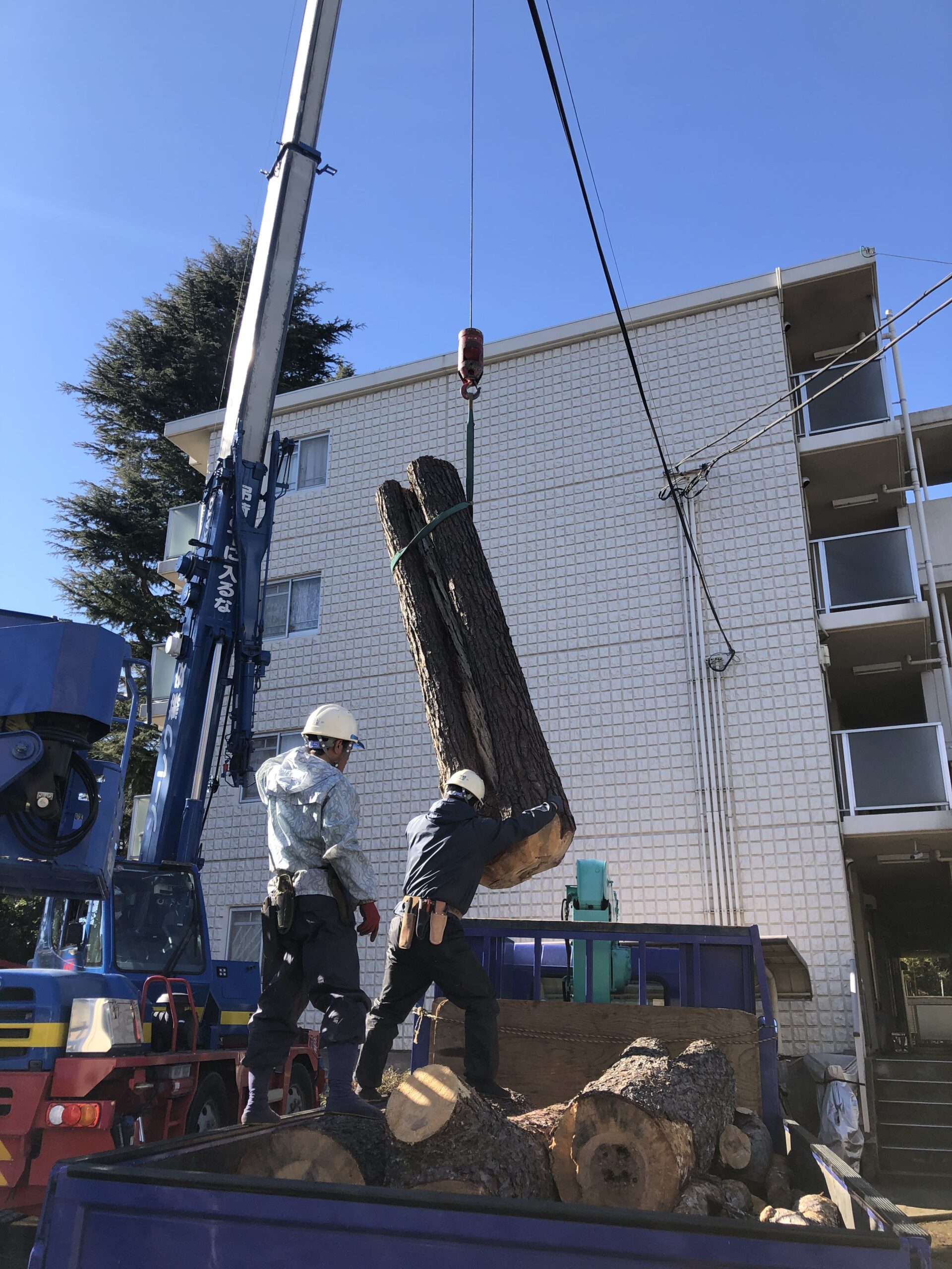 高さ15mもある大木ですから、切るのも大ごと。2月の晴れた日、高所作業車、クレーン車、大型トラックなどが入り、上から順々にダルマの輪切りのように切ってゆきました。作業の方たちは慣れたもので、淡々とやっていきますが、それでも1日1本。1本切ると、大型トラックの荷台がいっぱいになります。